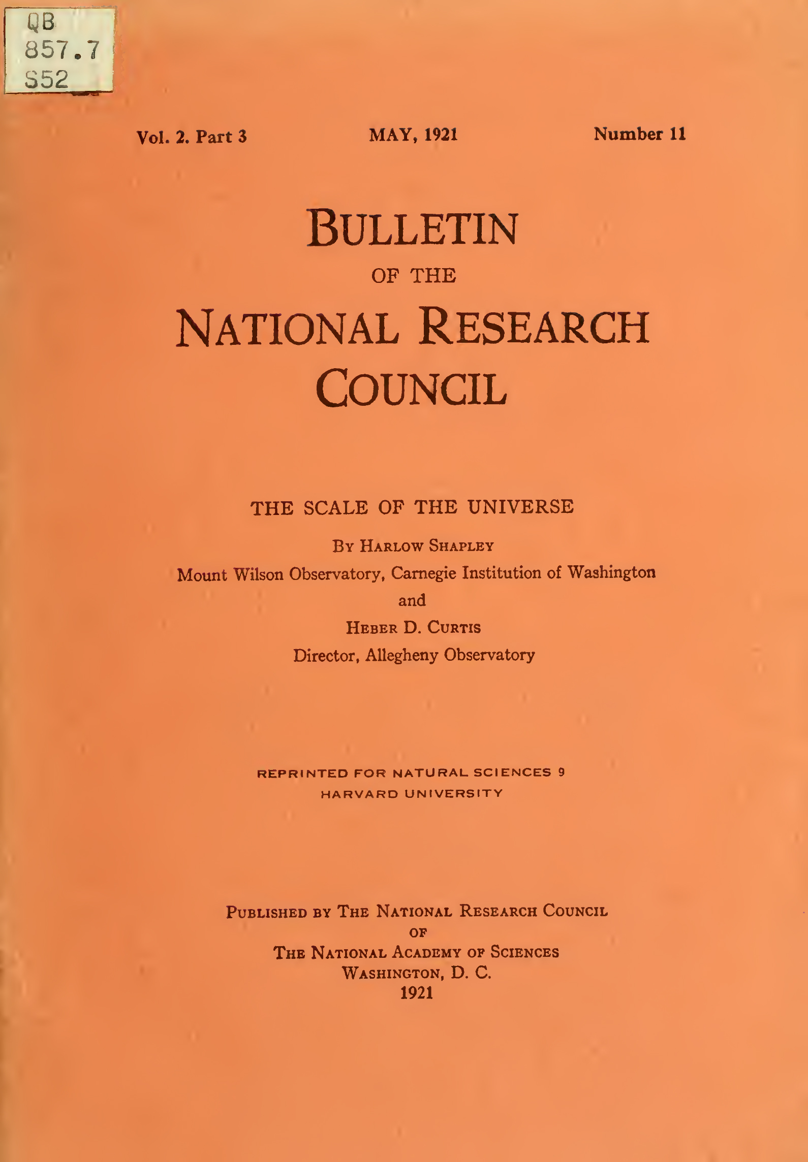 <b>9 Copertina dei resoconti scritti di Shapley e Curtis, 1921. </b>