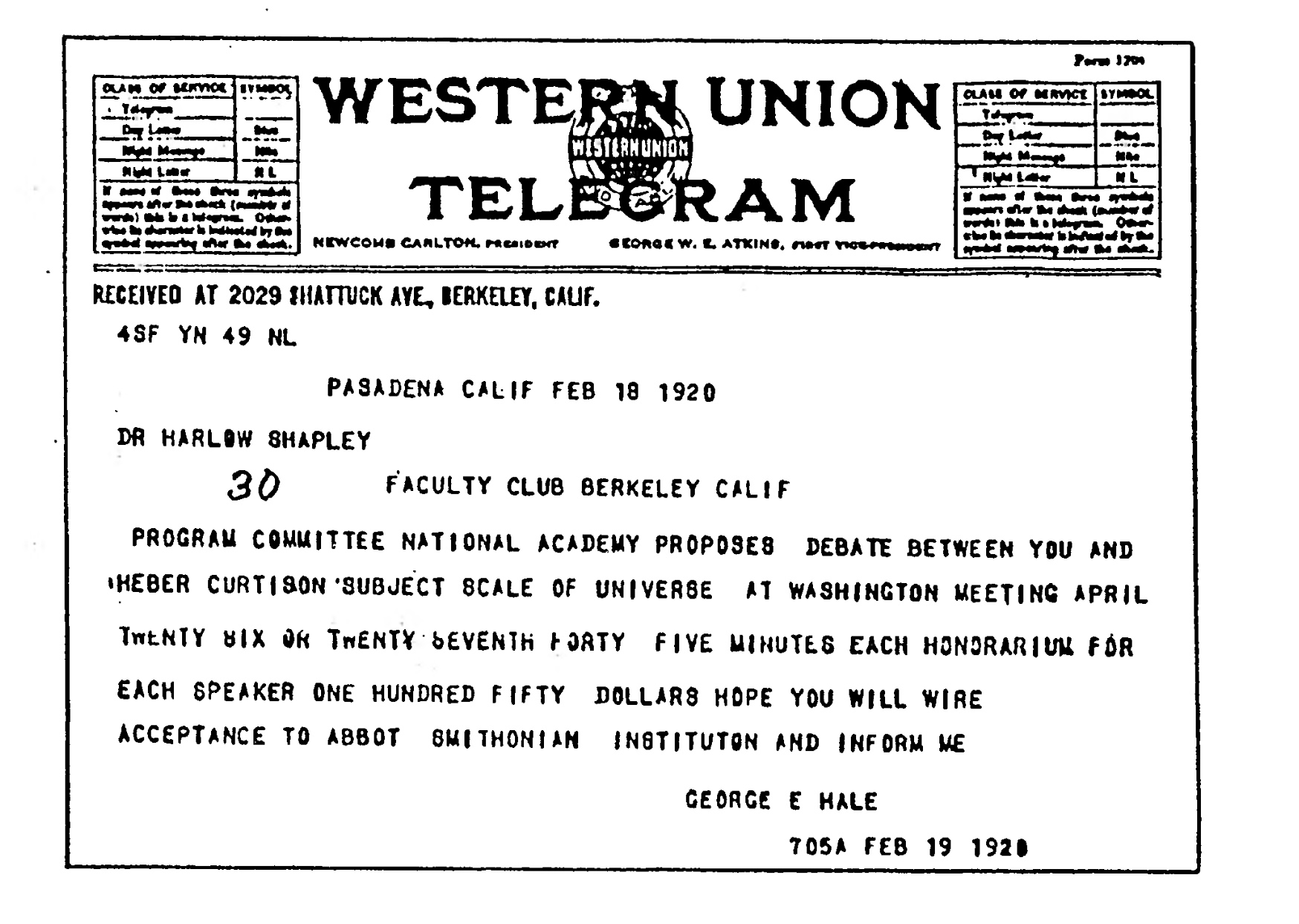 4. Il telegramma inviato a Harlow Shapley il 18 Febbraio 1920 per invitarlo al dibattito con Curtis.
