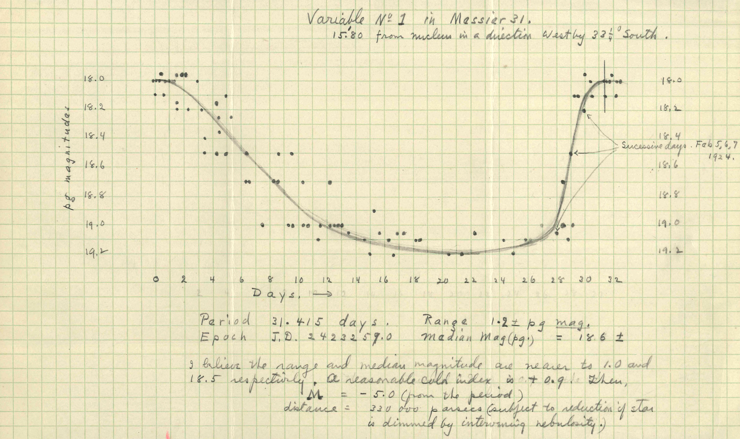 <b>10. La curva di luce della variabile Cefeide scoperta in Messier 31 da Hubble, realizzata a mano dallo stesso astronomo.</b>