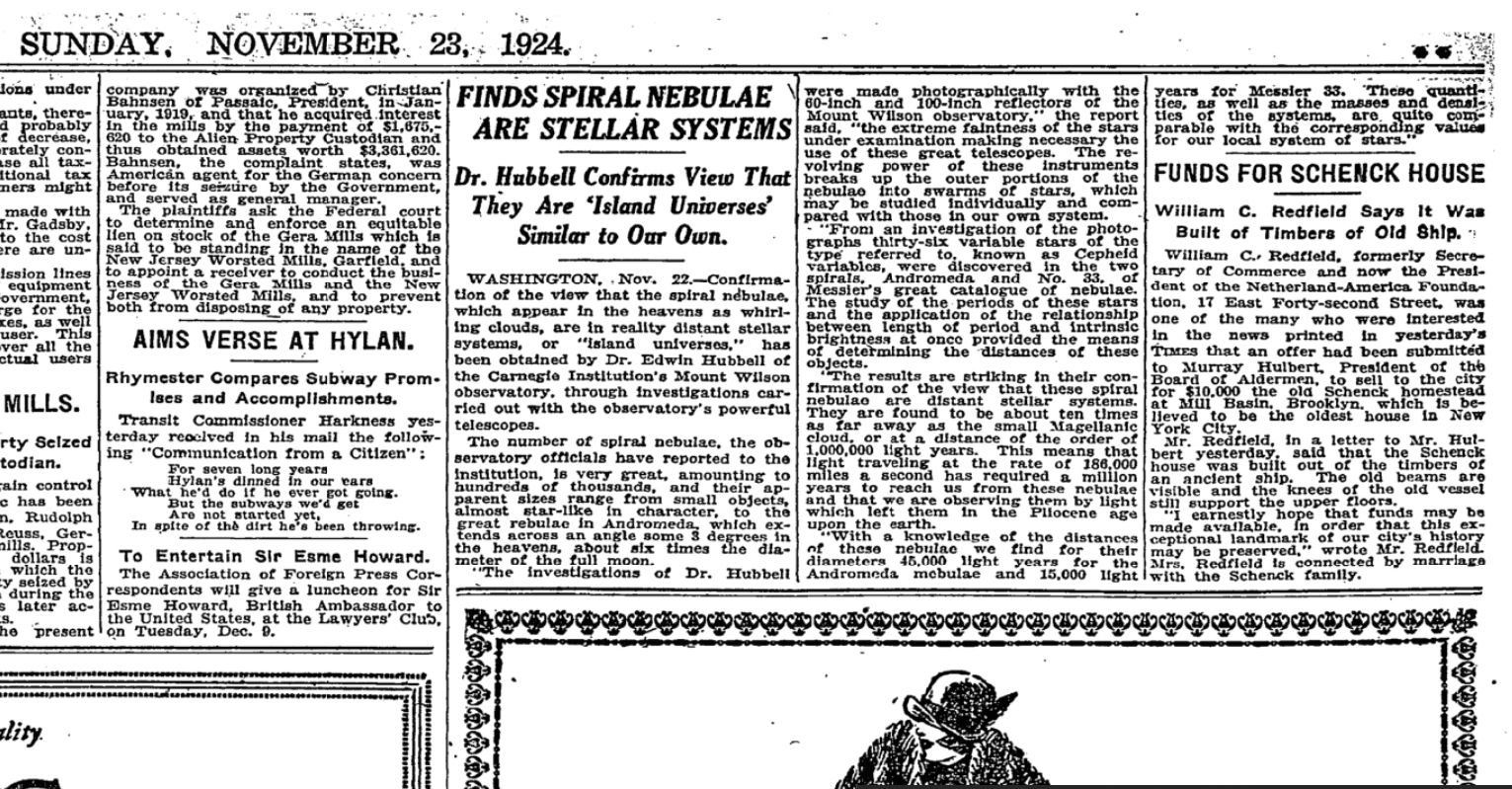 11. L’articolo su The New York Times dove si cita la scoperta della natura delle spirali, grazie alle osservazioni di Hubble di Messier 31. Si noti il refuso nel nome dello studioso, “Hubbell”.