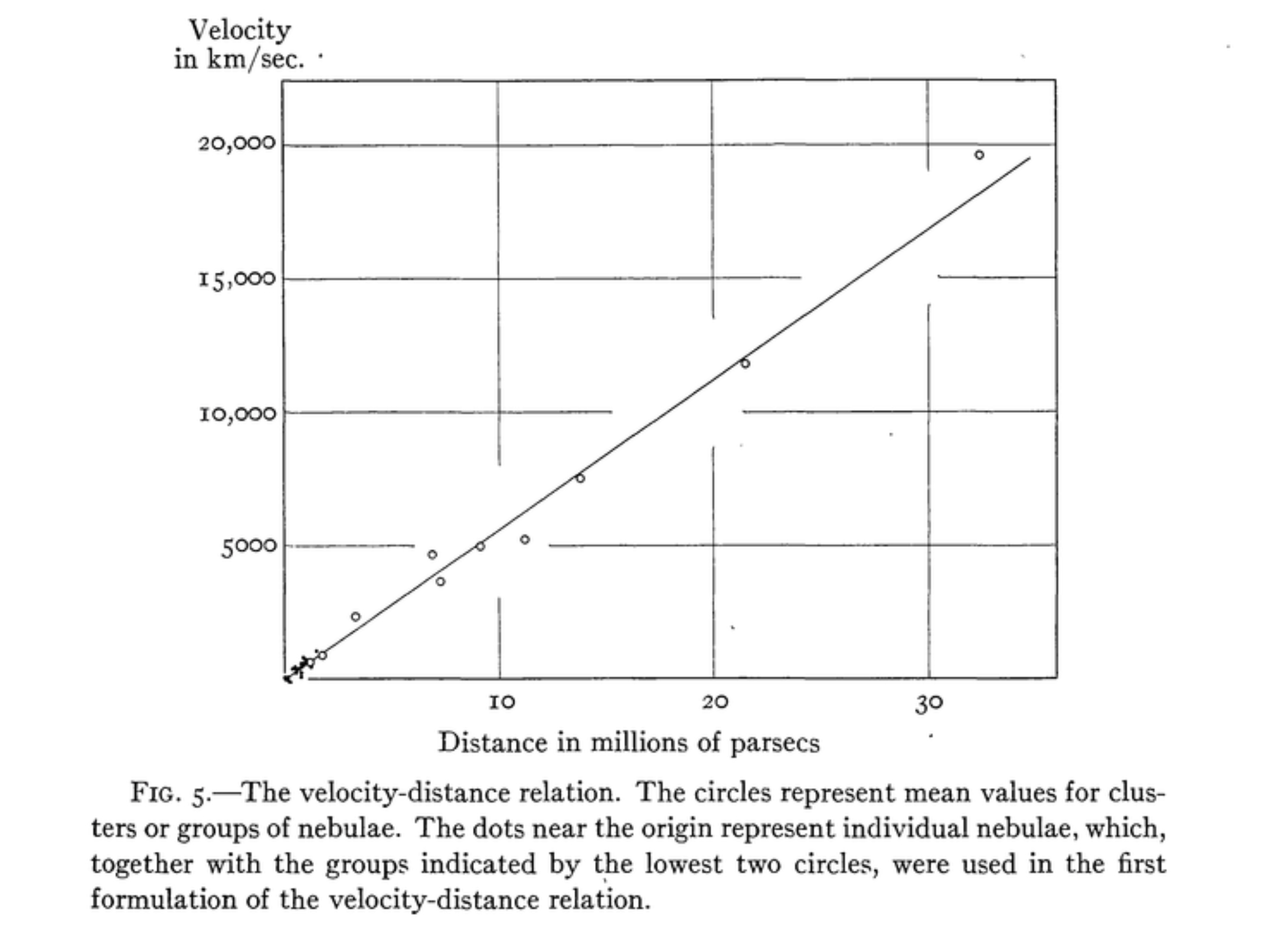 6. La fondamentale relazione lineare di Hubble-Humason tra velocità di recessione e distanze, 1931.</>